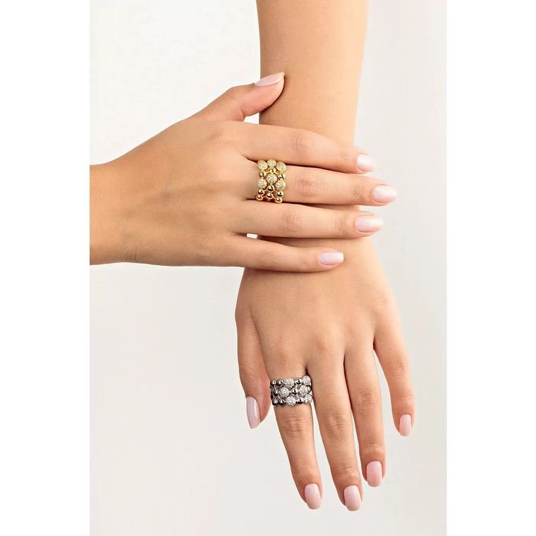 Anel ajustável com banho de ródio branco, apresentando três fileiras com esferas polidas e microzircônias cravejadas.