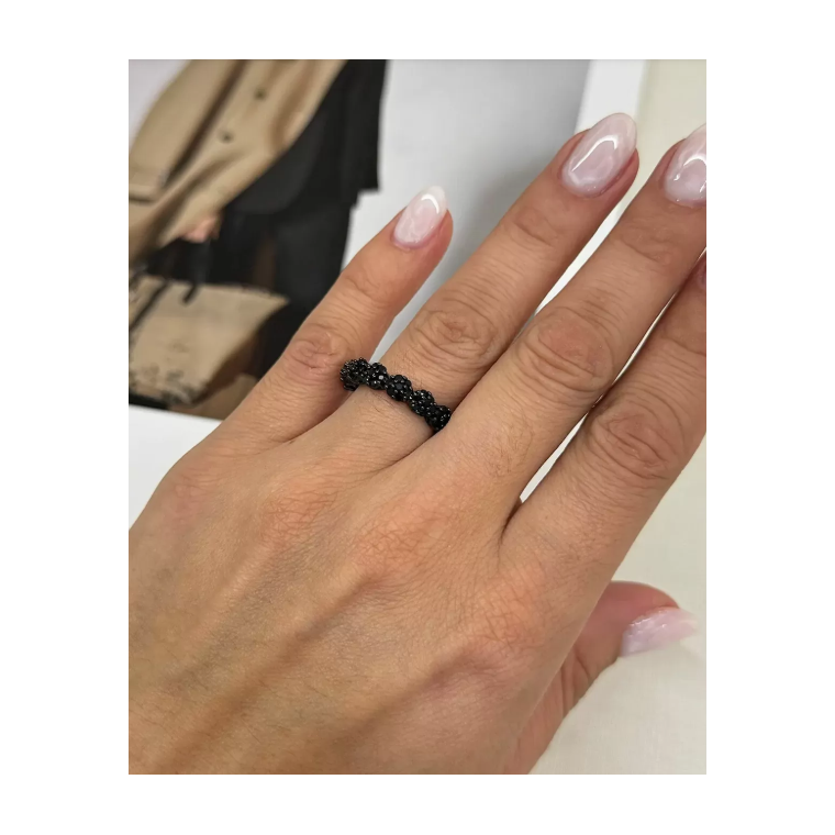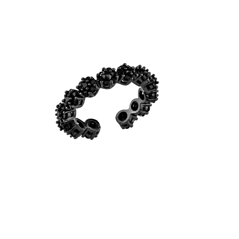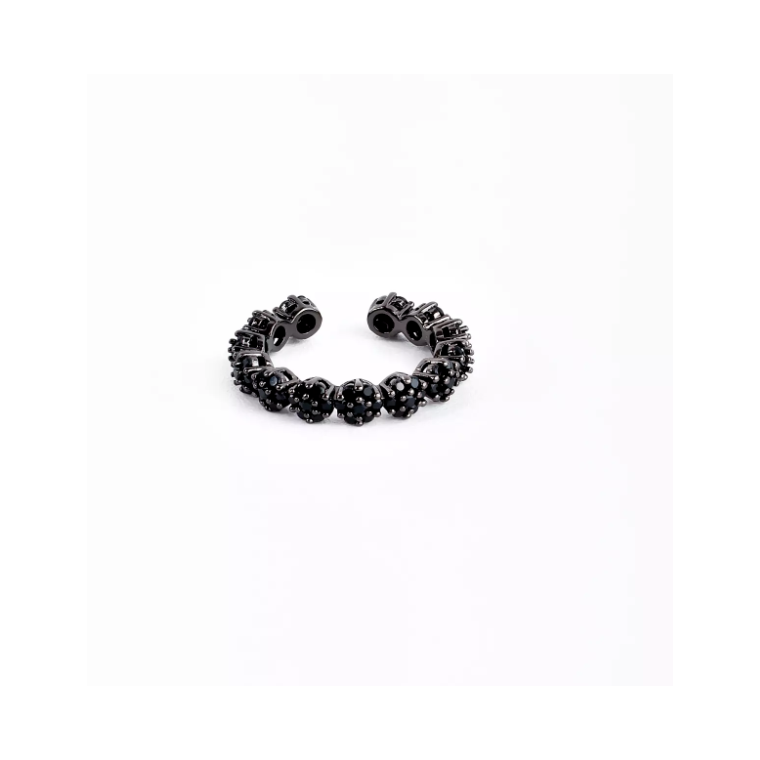 Anel ajustável com esferas cravejadas em zircônias pretas e acabamento em ródio negro.