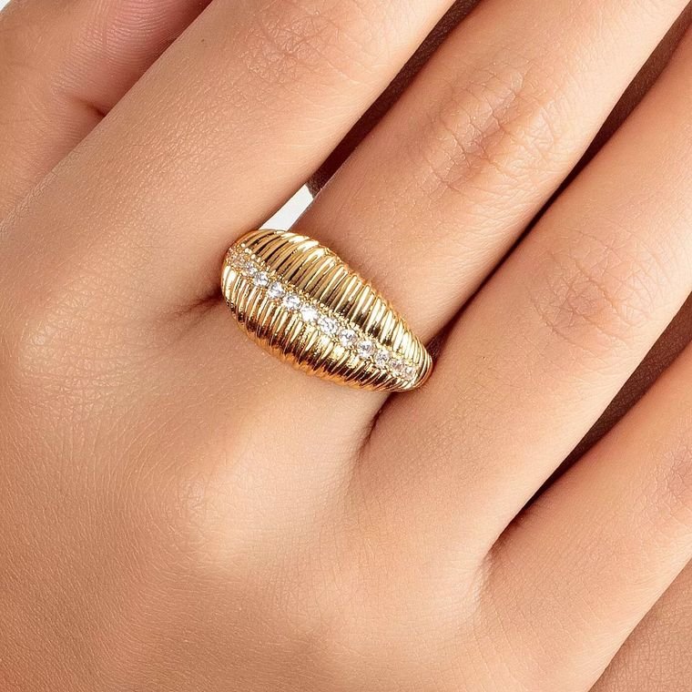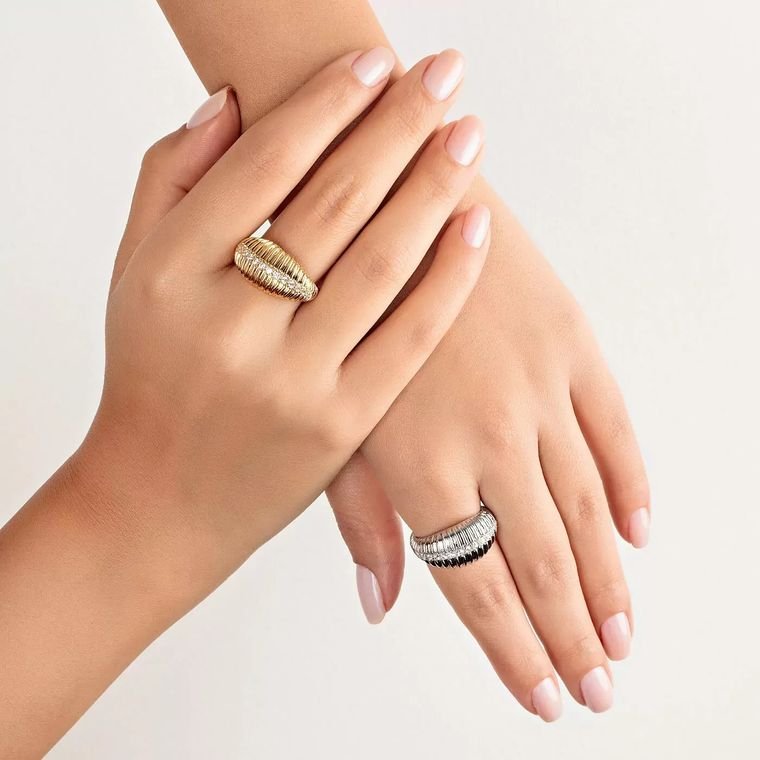 Este é um anel de design luxuoso e elegante, com uma estrutura robusta e um formato ajustável para se adaptar a diferentes tamanhos de dedos. Sua estética é clássica com um toque de modernidade. Acabamento e Brilho: A peça possui um brilho intenso e uniforme que destaca suas linhas e detalhes. Disponível em um resplandecente acabamento dourado e em um sofisticado banho de ródio branco, oferecendo versatilidade e realçando a beleza do design. A superfície apresenta um padrão de nervuras verticais e uniformes que percorrem toda a sua extensão, criando um efeito texturizado e um jogo de luz fascinante. Design e Ornamentação: O anel tem um corpo largo e arredondado, com um padrão que lembra delicadas ranhuras ou ondulações, conferindo-lhe uma textura tátil e visual. Uma linha central de pequenas pedras brilhantes é habilmente cravejada ao longo do topo do anel, adicionando um ponto focal de luminosidade e sofisticação. O design aberto na parte inferior do anel garante seu caráter ajustável, proporcionando conforto e versatilidade no uso. As extremidades da abertura são sutilmente trabalhadas, mantendo a harmonia do design. Estilo e Versatilidade: Sua presença marcante e o brilho das pedras o tornam uma peça ideal para adicionar um toque de glamour a qualquer produção. É perfeito para quem busca um acessório que combine volume com delicadeza, adequado tanto para o uso diário quanto para eventos especiais, com a opção de escolher o acabamento que melhor se alinha ao seu estilo.