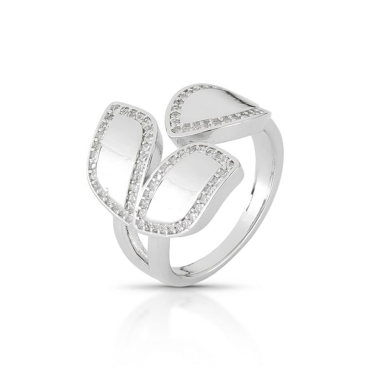Design de Folhas Cravejadas: O destaque deste anel é o seu topo, composto por três elementos em formato de folha, que se sobrepõem delicadamente. Cada folha possui uma de suas bordas ricamente cravejada com zircônias, proporcionando um brilho delicado que realça as curvas do design. As superfícies lisas das folhas criam um contraste elegante com o cravejamento.